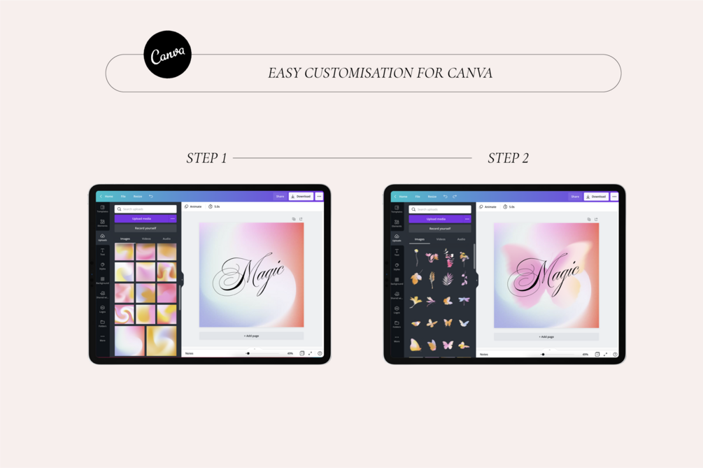 We have included a set of 108 Grainy Gradient Textures and 42 Spring Background with 3 different sizes ready to use.
